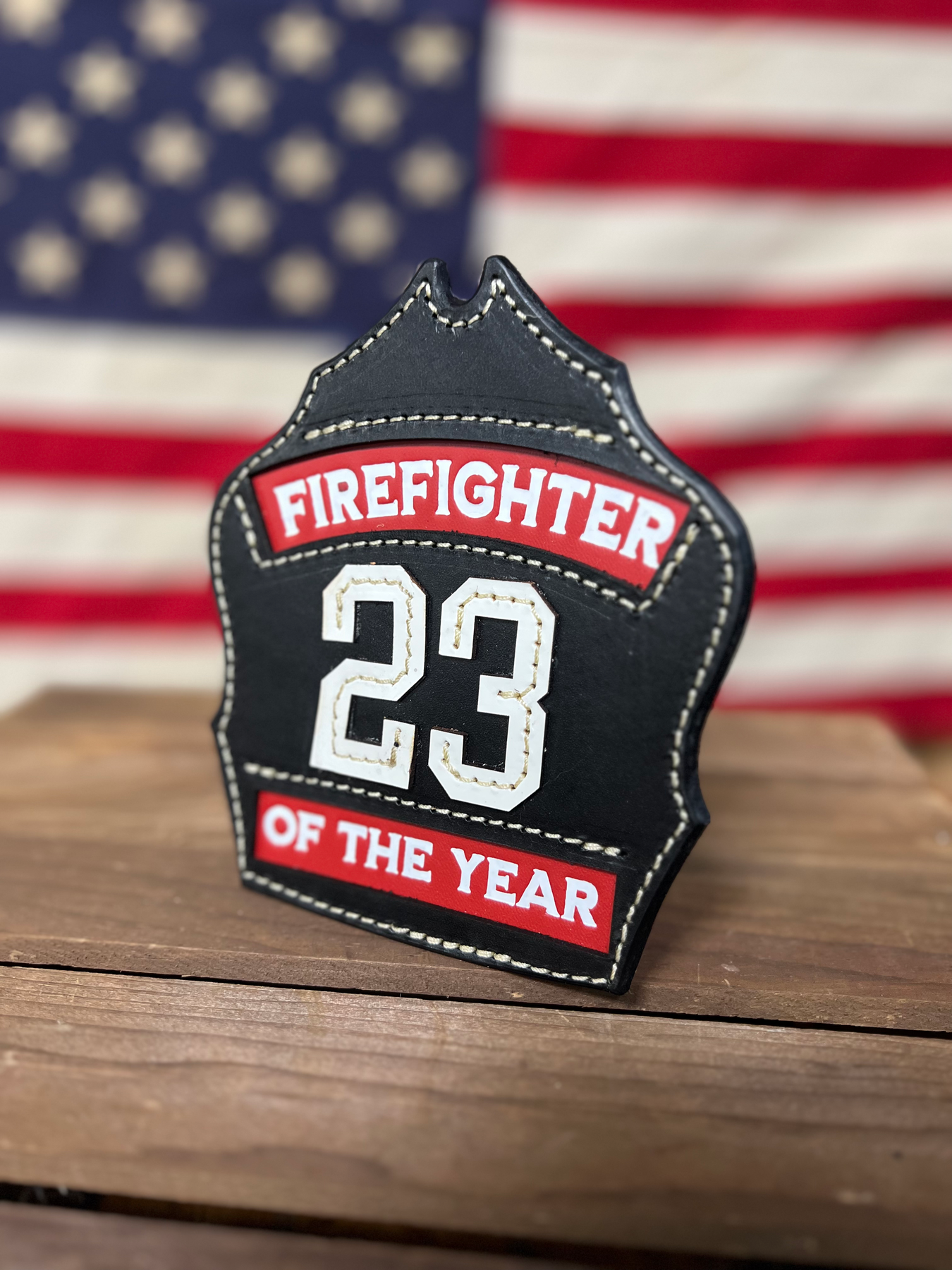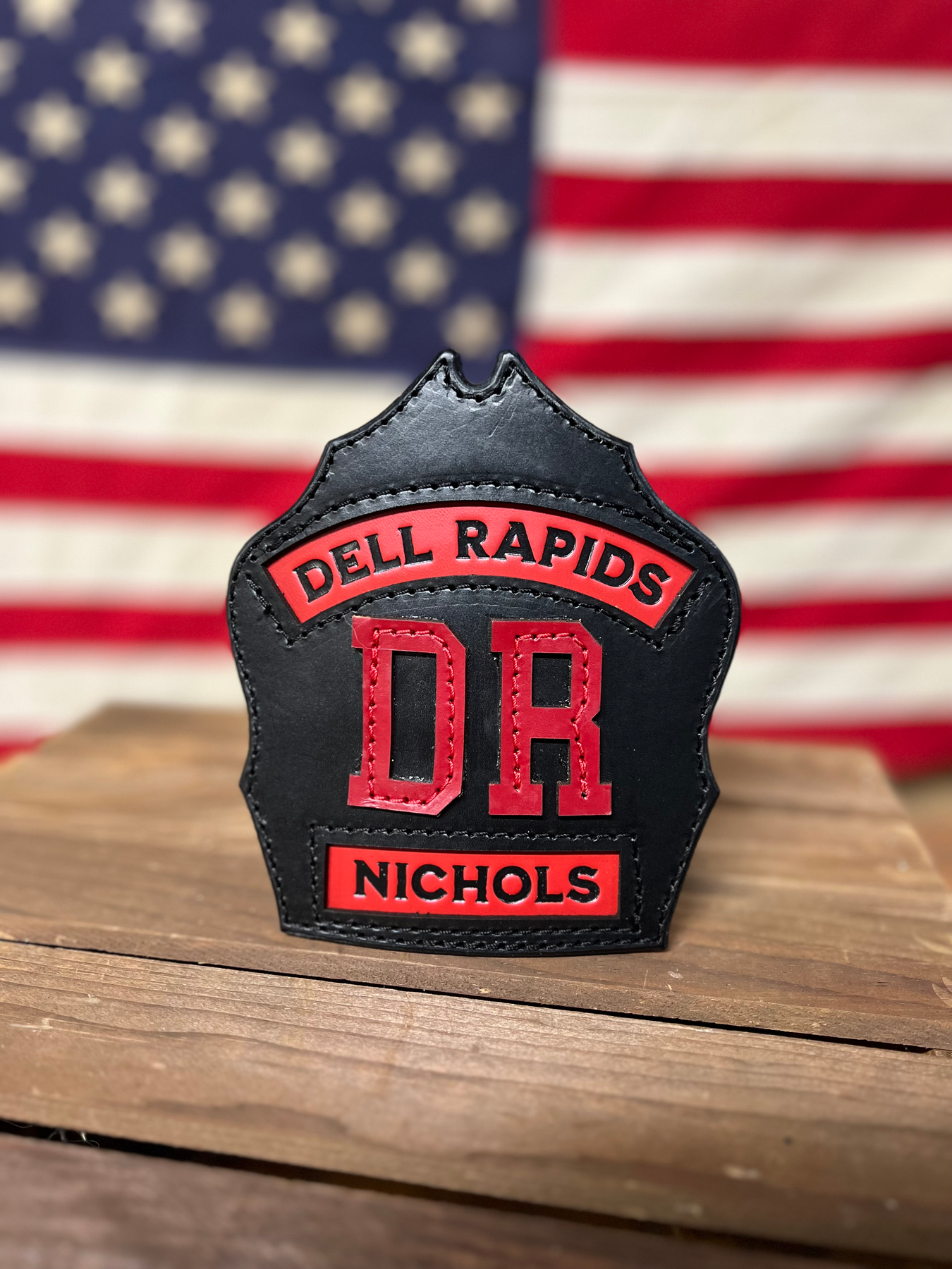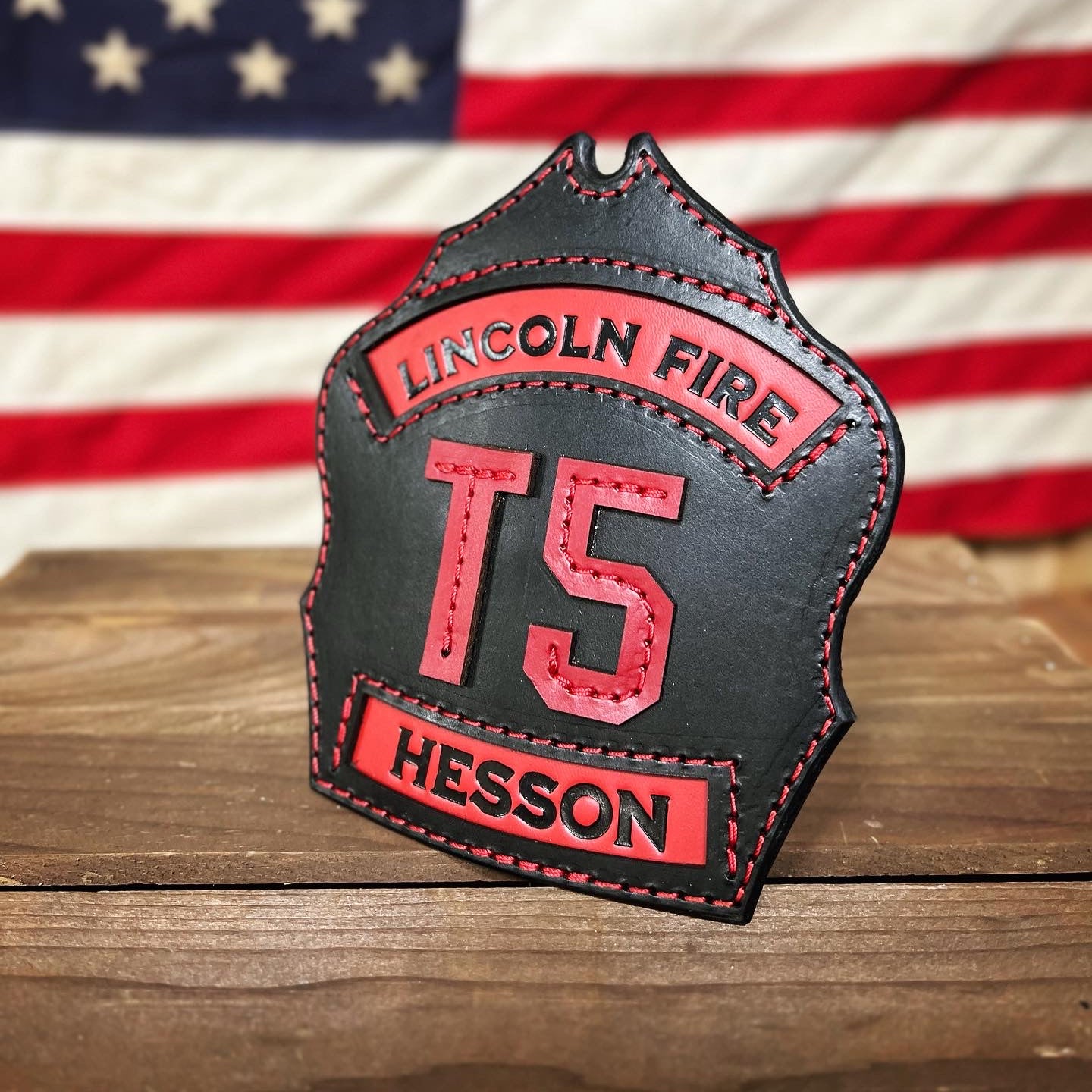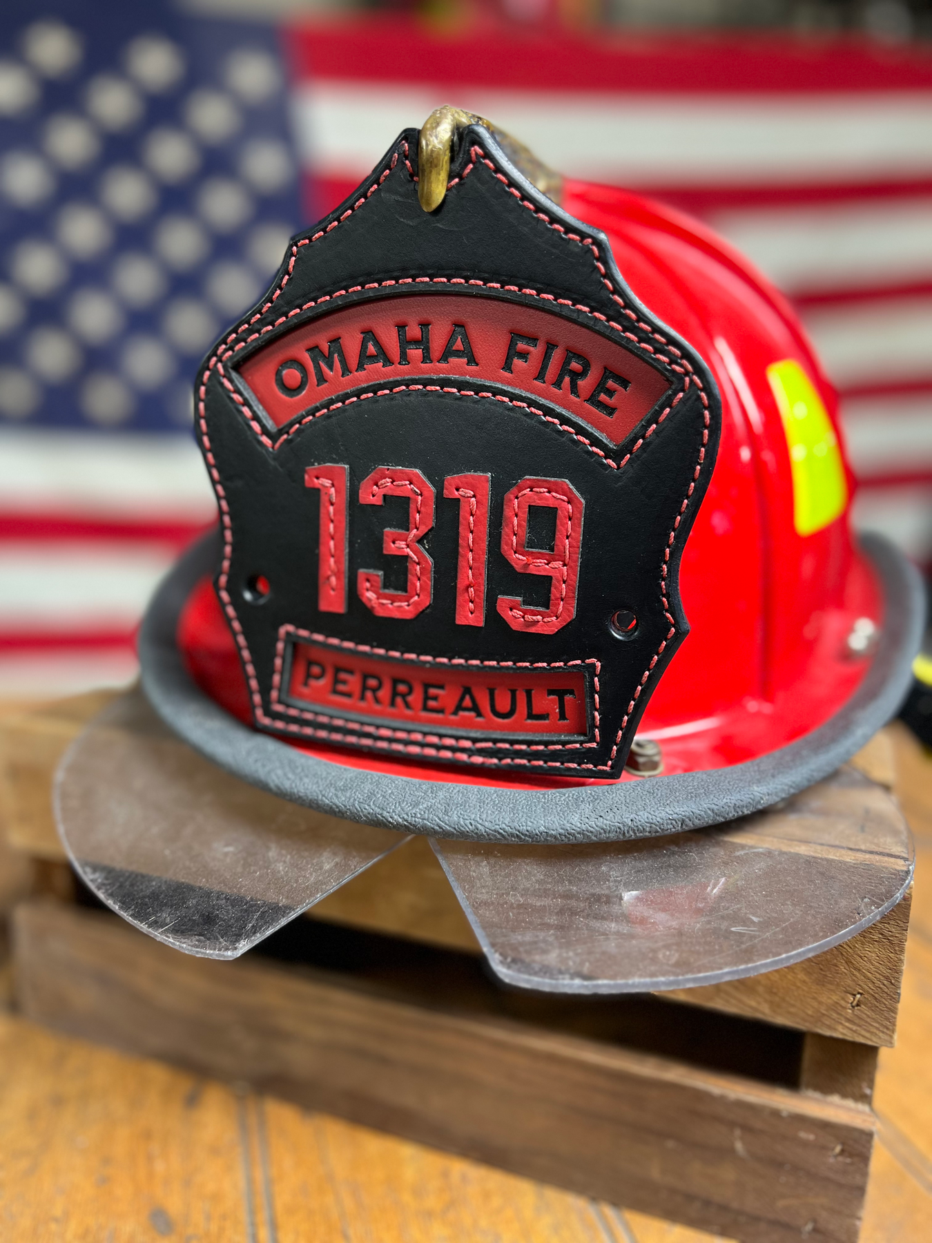 Our traditional style helmet front is handcrafted from top grain leather, and custom made-to-order. These feature top and bottom rockers, as well as raised characters in the center to show off your company assignment or ID number. Rocker text is custom stamped and hand painted, no stickers here!